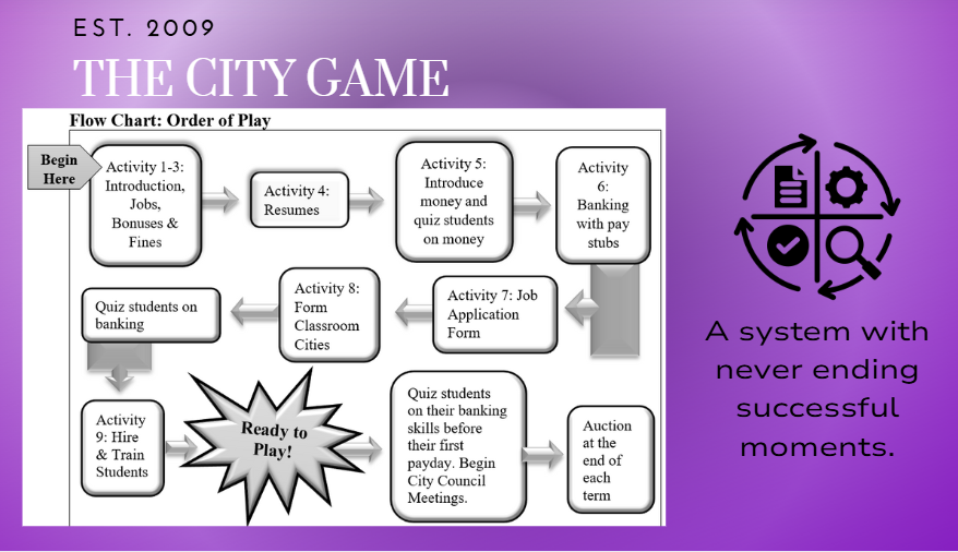 The City Game is a classroom economy system designed to teach students financial literacy, responsibility, and purposeful communication. Rooted in real-world concepts, students earn biweekly pay, rent their desks, take on meaningful jobs, and participate in term end auctions. As students fulfill their roles, the classroom begins to run itself, freeing the teacher to focus more on one-on-one support. More than just a management tool, The City Game gives students a purpose beyond academics. They feel valued, empowered, and part of a thriving classroom community where learning is both relevant and rewarding.