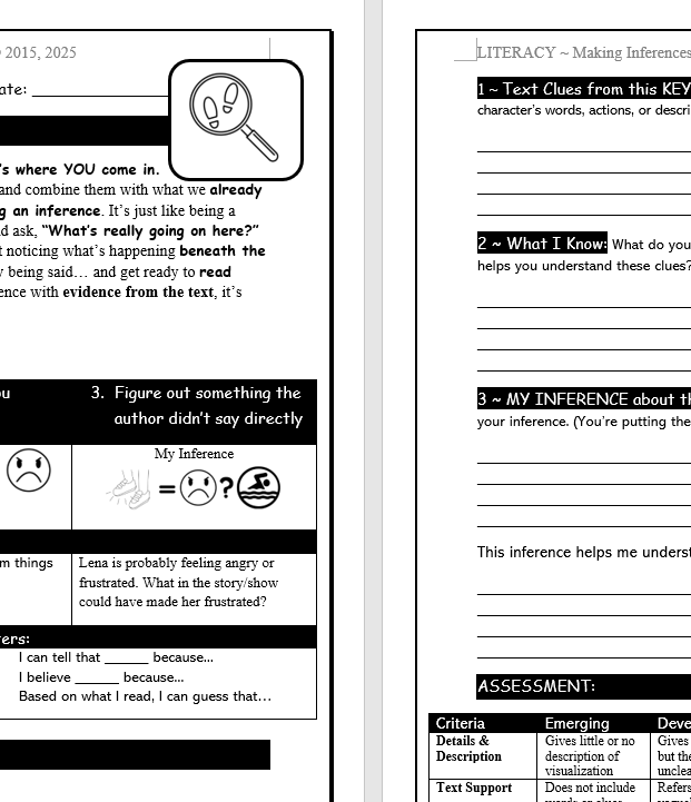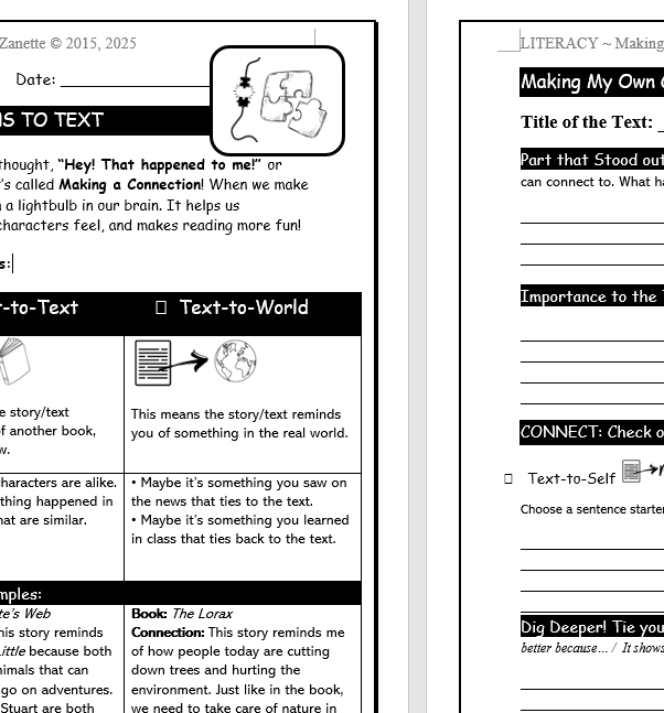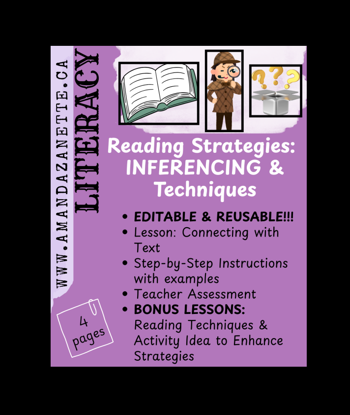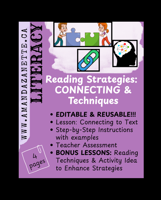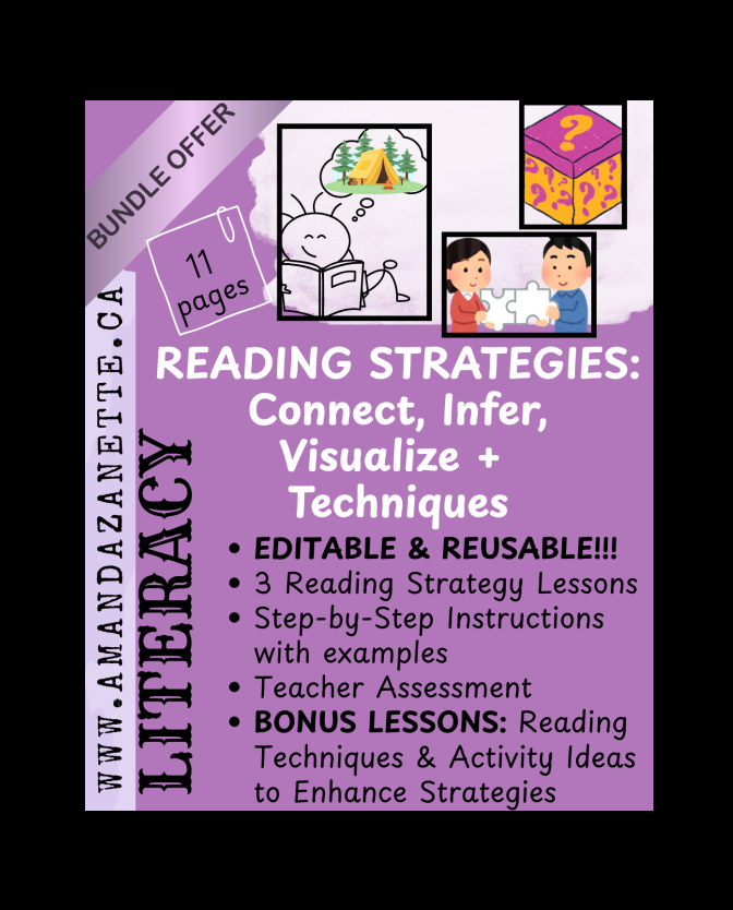 This three-part lesson bundle is designed to help students build essential reading comprehension strategies through thoughtful, easy-to-use activities. Each lesson ~ Making Connections, Inferencing, and Visualizing ~ includes step-by-step guidance, student-friendly sentence starters, and clear examples to support deeper thinking and engagement with texts.