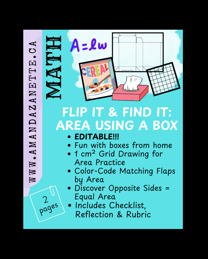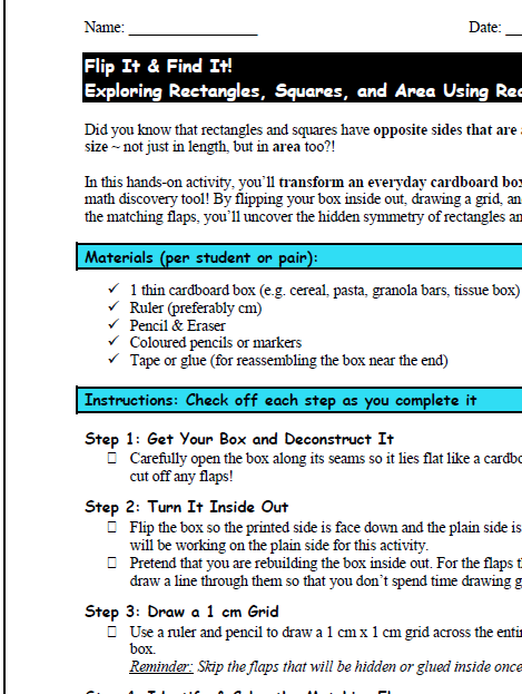 Bring math to life with this creative, real-world activity that gets students thinking, measuring, and discovering! In Flip It & Find It, students transform an ordinary cardboard box from home into a colorful geometric investigation. By flipping the box inside out, drawing a 1 cm² grid, and identifying matching areas, students will explore the concept that rectangles and squares have opposite sides with equal area.